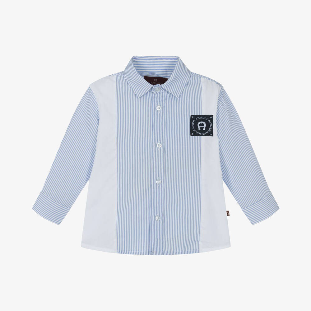 Smart blue and white striped shirt for baby boys by AIGNER, with white panels on the front. Made in soft and lightweight cotton poplin, it fastens with branded buttons on the front and cuffs. An embroidered logo patch on the chest, features the signature 'A' horseshoe logo for a distinctive look.