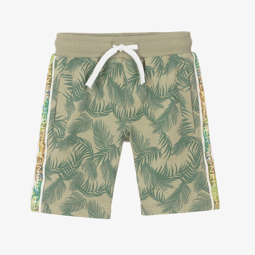 Khaki green shorts for baby boys by German designer AIGNER, made from soft and stretchy cotton jersey. These casual shorts have a palm tree print and feature branded logo panels on the side. The plain pocket on the back has the brand's signature 'A' horseshoe logo in white embroidery. They have a comfortable drawstring waist and pockets on the front.