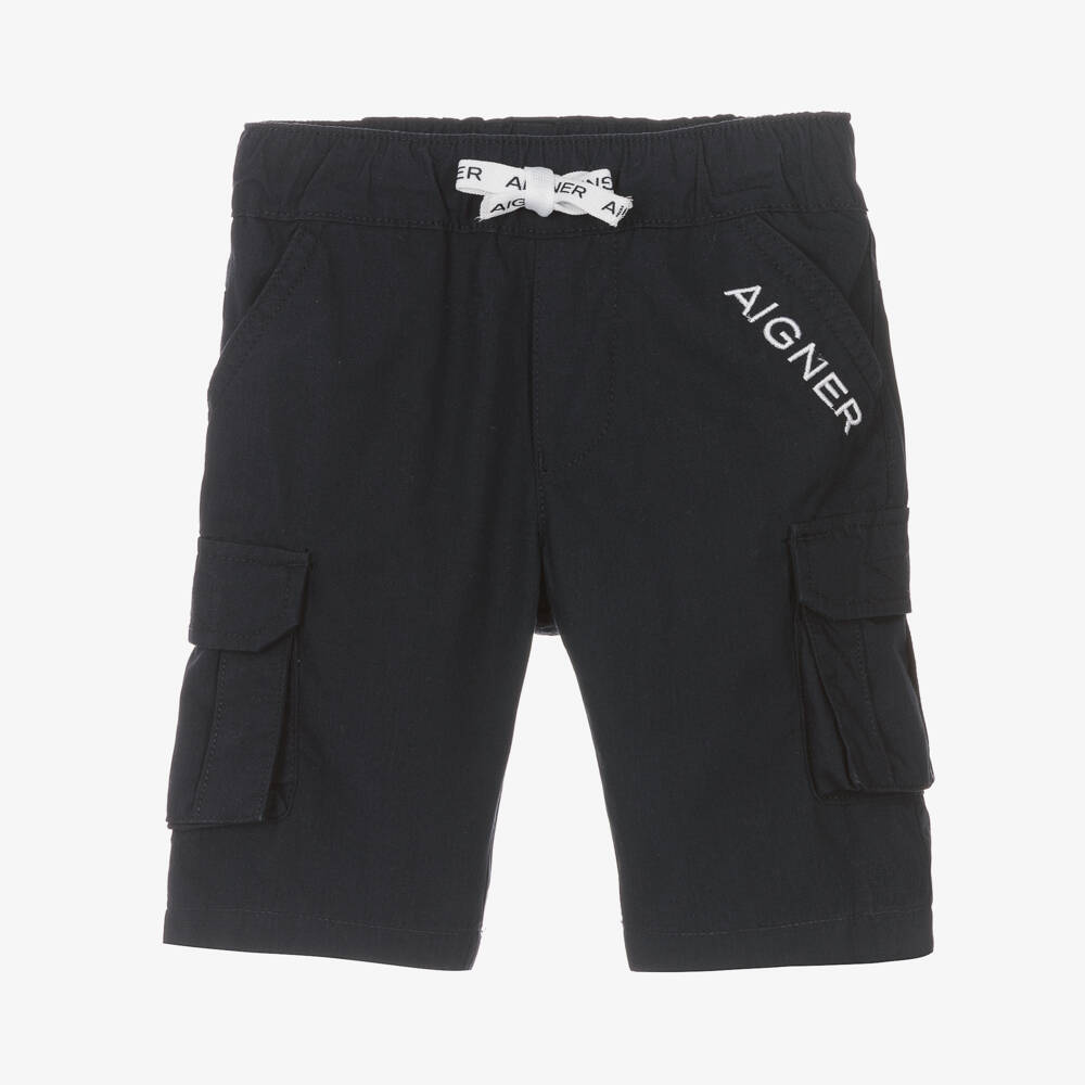 Navy blue cotton cargo shorts for baby boys by AIGNER. Bermuda length, they have a white logo embroidered by one of the slanted front pockets and two cargo pockets with velcro fastening flaps. Easy to pull-on, they have an elasticated waistband with a logo branded white drawstring.