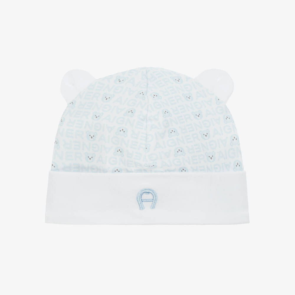 Adorable white hat for baby boys by AIGNER, patterned with a pale blue logo and teddy bear design. Made in super soft Pima cotton jersey, it has cute 3D teddy ears on the top and a turn-up brim with the brand's signature 'A' horseshoe logo embroidered in blue.