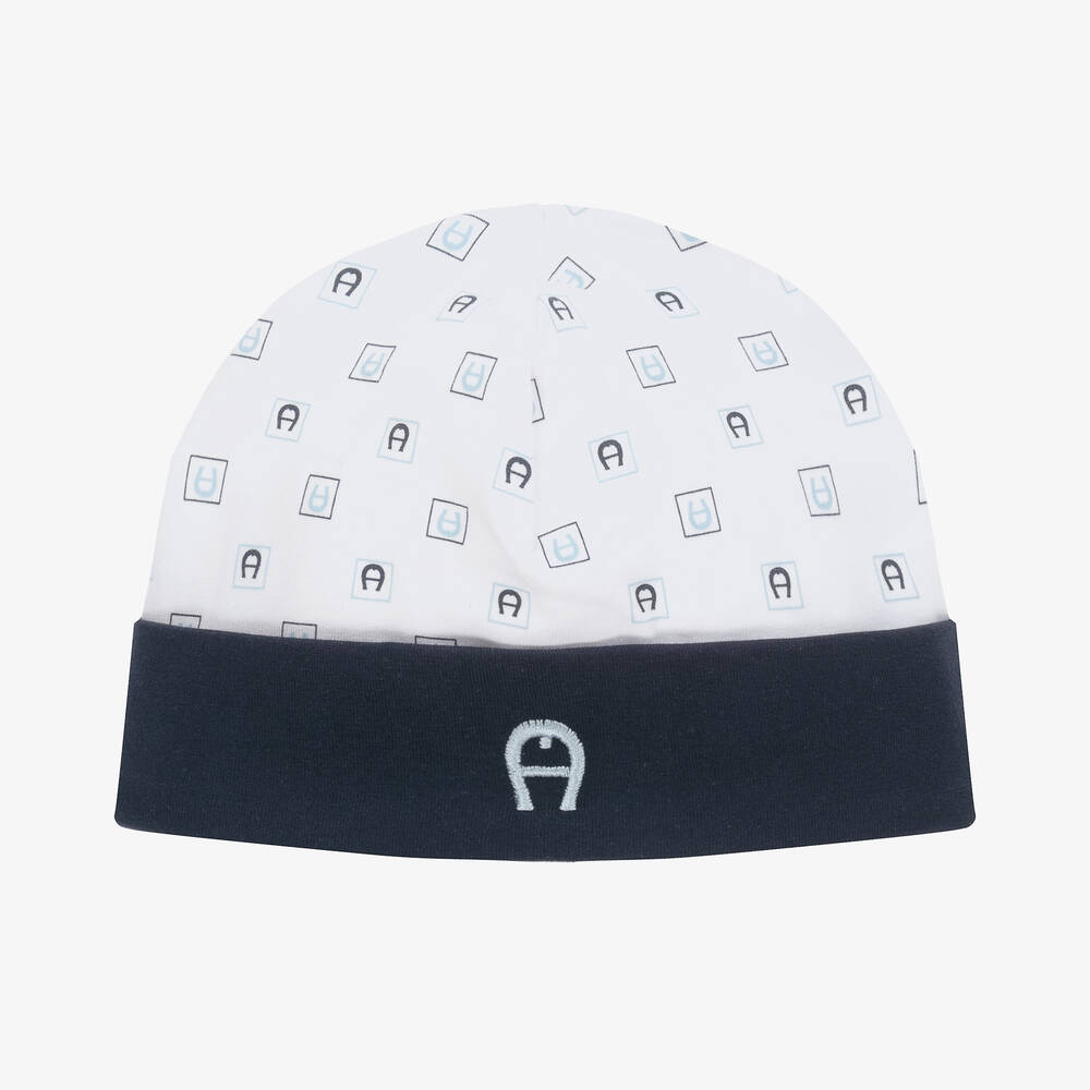 A white layette hat for baby boys by AIGNER, with a navy blue turn-up brim, embroidered with the brand's signature 'A' horseshoe logo. Made in soft Pima cotton jersey, this comfortable hat is patterned with the designer's iconic blue logos for a distinctive finish.