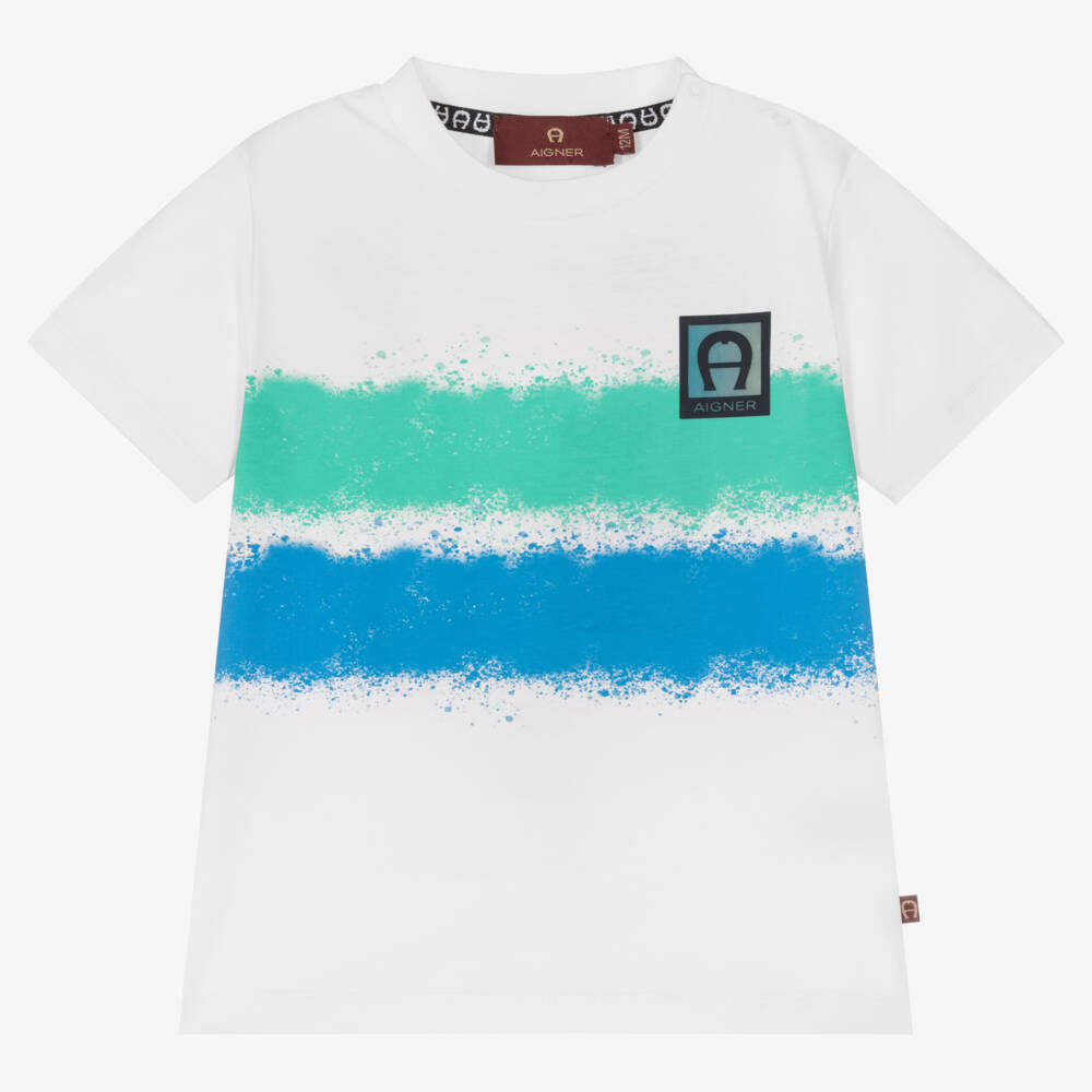 Baby boys white crew neck T-shirt by AIGNER, made in soft cotton jersey. Fastening with poppers on one shoulder, it has a green and blue paint splatter stripe across the front with a rubberised signature 'A' horseshoe logo patch.