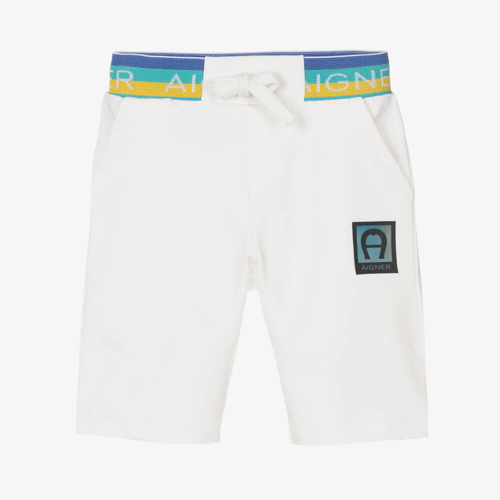 White shorts for baby boys by German designer AIGNER, made from soft and stretchy cotton jersey. Designed for comfort and easy dressing, these casual shorts have a stretchy blue and yellow stripe logo waistband with decorative tie strings and pockets on the front and back. There is a rubberised holographic signature 'A' horseshoe logo on the front.