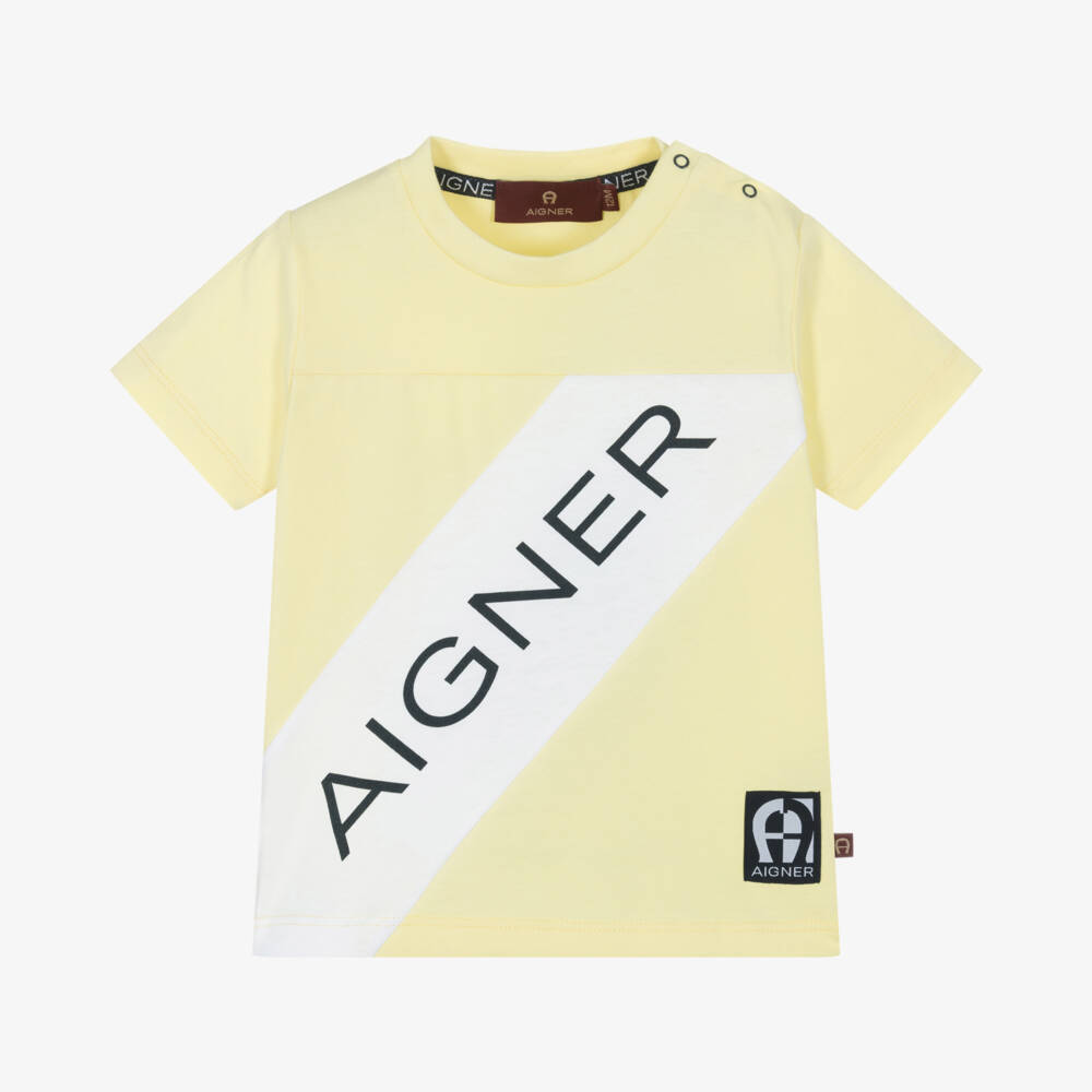 Yellow T-shirt for baby boys by AIGNER, made in soft and stretchy cotton jersey. It has a bold white stripe across the front with a navy blue logo for instant brand recognition. There is a logo patch by the hem featuring the signature 'A' horseshoe logo and popper fastenings on one shoulder to help with dressing.