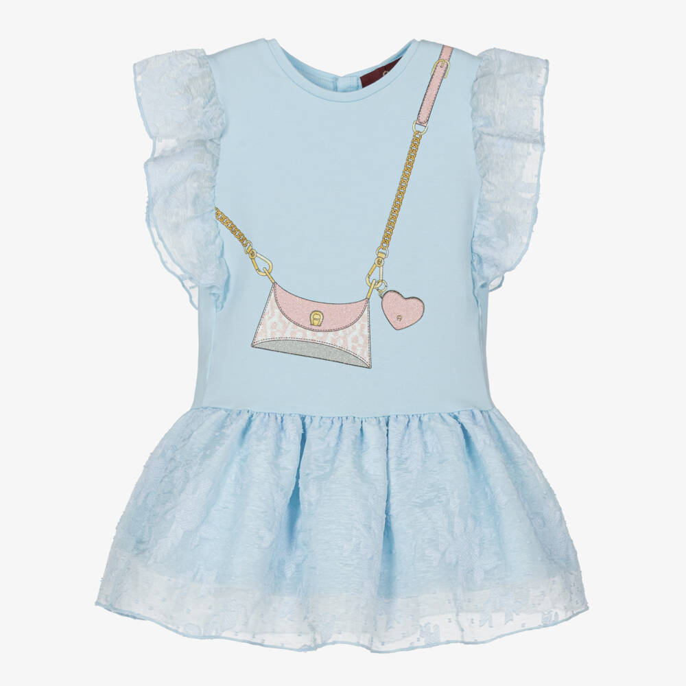 Cute pale blue dress for baby girls by AIGNER, made in soft cotton jersey for comfort. The flutter sleeves and voluminous skirt are made using soft organza, embroidered with flowers and dots for a sweet, feminine look. It fastens simply with neat poppers on the back and has a sparkly, pink and gold trompe l'oeil handbag print on the chest for a fun finish.