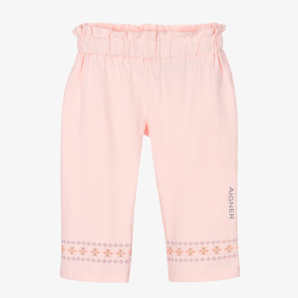 Little girls light pink casual trousers by German designer AIGNER, made in soft cotton jersey. These breathable trousers have a colourful diamond pattern print around the hem, complemented by the brand logo on one leg. Designed for a snug and comfortable fit, they have a stretchy elasticated paperbag waistband, for easy dressing.
