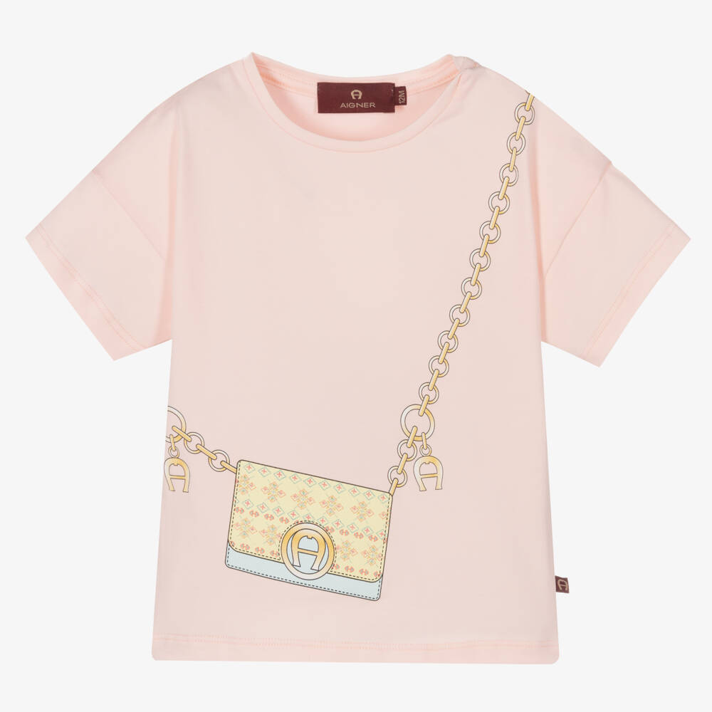 Pastel pink T-shirt for baby girls by German designer AIGNER, made in soft and stretchy cotton jersey. It has a crossbody bag print, with a gold chain pattern and the brand's signature 'A' horseshoe logo print. There are concealed popper fastenings on one shoulder for comfort and easy dressing.