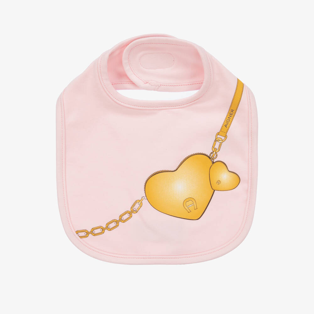 Sweet pink bib for baby girls by AIGNER, made in beautifully soft Pima cotton jersey. This useful feeding accessory is ideal for dribble and spills. It has the designer's signature 'A' horseshoe logo printed on the front in a cute gold handbag motif, and fastens with an easy-to-use velcro strap on the back of the neck.
