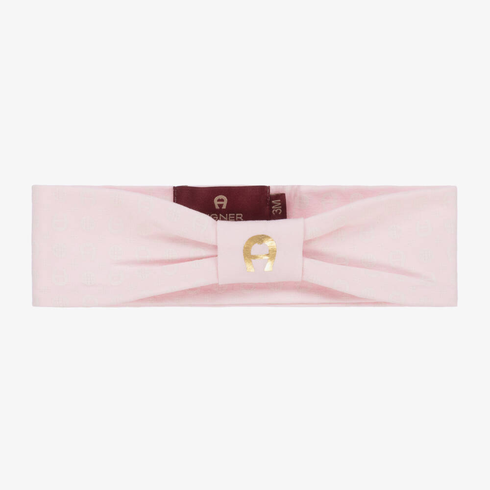 Pale pink headband for baby girls by AIGNER, made in soft and stretchy Pima cotton jersey. Patterned with the brand's signature 'A' horseshoe logo in white, it has a knotted effect detail on the front with a matching logo print in gold foil.