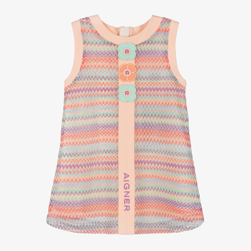 In sweet pastel colours, a sleeveless A-line dress for baby girls by AIGNER. It is made from delicate crochet style lace in a zigzag striped pattern with pale coral pink cotton jersey trims. Down the front, it has blue and pink flower appliqués embroidered with the brand's signature 'A' horseshoe logo in purple. It is fully lined in ivory cotton voile for comfort and fastens with a seamless zip on the back.