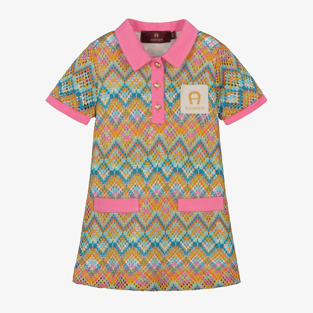 A lovely pink dress for baby girls by AIGNER, designed with a colourful zigzag pattern. Woven with a lacy crochet-effect, it is styled with pink trims and faux pockets, with sweet, heart-shaped gold button fastenings on the front. There is a branded patch on the chest for designer appeal and a soft cotton lining for comfort.