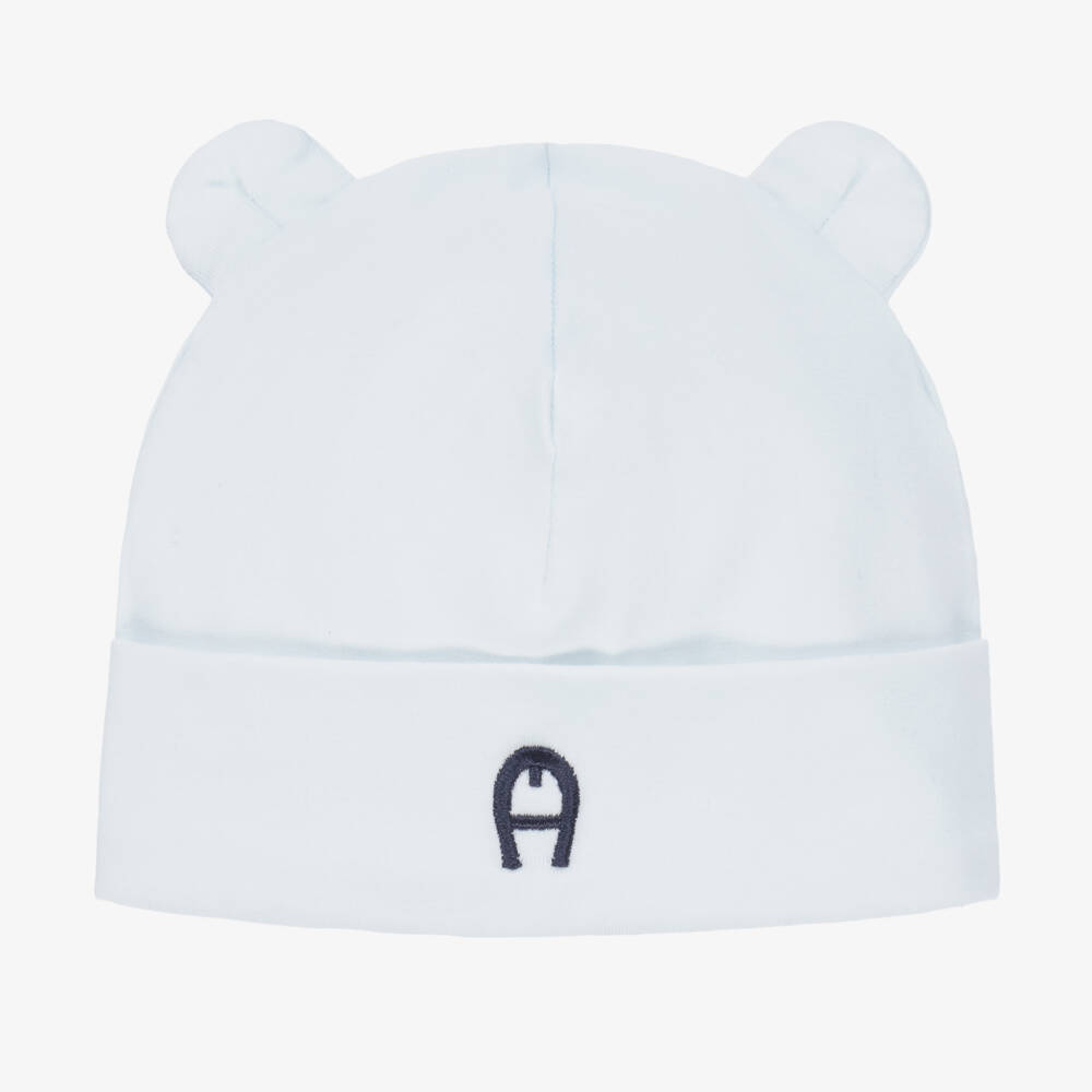 Pale blue hat for baby boys and girls by AIGNER. It is made in super soft Pima cotton jersey, with sweet little ears on top. The brand's signature 'A' horseshoe logo is embroidered on the brim in navy blue.
