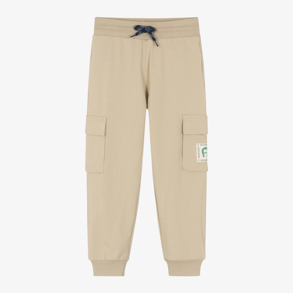 Casual and comfortable, these beige joggers for boys are by AIGNER. Made in soft cotton jersey, they have elasticated ankles and concealed side seam pockets. There are two cargo pockets on the legs, one with a signature 'A' horseshoe logo patch. The ribbed waistband is elasticated and has drawstring ties to adjust the fit.