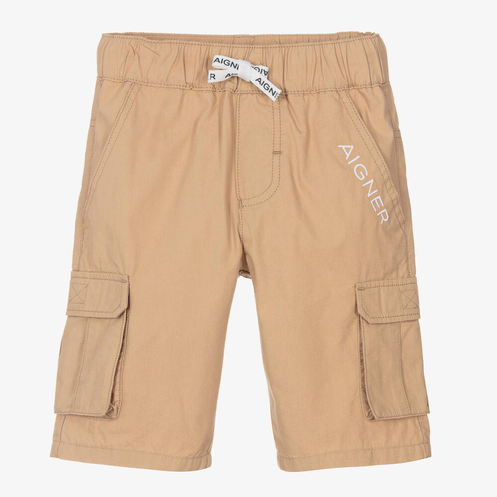 Dark beige cargo shorts for boys by AIGNER, with a white logo embroidered on the front. These Bermuda length shorts are made from soft cotton with slanted front pockets, cargo pockets with velcro fastening flaps and two back pockets. Easy pull-on, they have an elasticated waistband with a logo branded white drawstring.