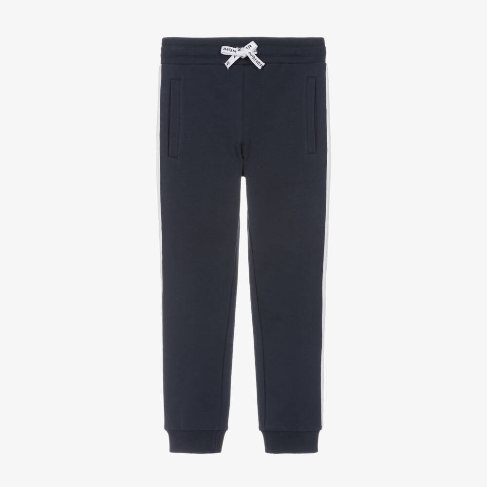 Navy blue joggers for boys from AIGNER, made in lightweight cotton sweatshirt jersey with sporty white side trim. For comfortable wear, this cuffed style has an elasticated waistband with a branded drawstring for an adjustable fit. There are useful front pockets and a single pocket on the back with a white embroidered logo, featuring the signature 'A' horseshoe.