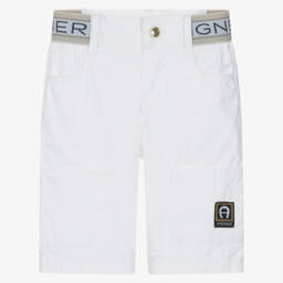 Brown shorts for little boys by AIGNER, made in soft cotton with a slight stretch for comfort. Designed with multiple, practical pockets, they have an embroidered logo patch on the front. The elasticated waistband is stretchy for a great fit, with beige and black logo detailing and a branded, gold-tone button fastening for instant designer appeal.