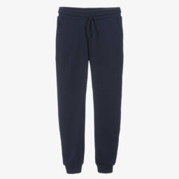 Navy blue cotton joggers for boys by AIGNER, with sporty white trims. Great for casual wear, they are made in comfortable jersey, with side seam pockets and a drawstring waistband. There are cargo-style pockets on both legs, with the brand's signature 'A' horseshoe logo patch adding a designer finish.