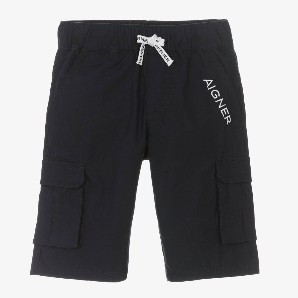 Navy blue cargo shorts for boys by AIGNER, with a white logo embroidered on the front. These Bermuda length shorts are made from soft cotton with slanted front pockets, cargo pockets with velcro fastening flaps and two back pockets. Easy pull-on, they have an elasticated waistband with a logo branded white drawstring.