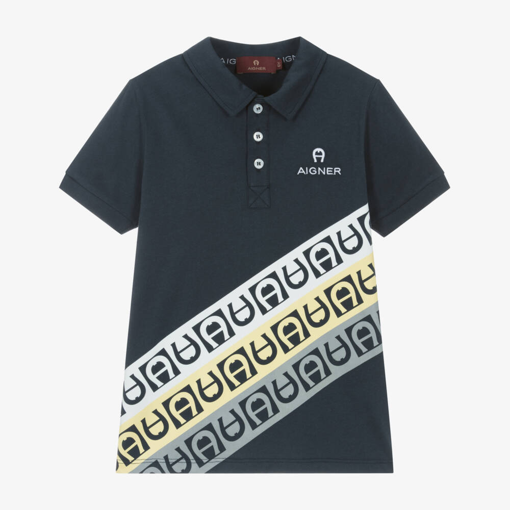 Navy blue polo shirt for boys by AIGNER, made in soft cotton jersey, with a pointed collar and branded button fastenings on the front. Comfortable and easy wearing, it has white, yellow and grey stripes on the front patterned with the brand's signature 'A' horseshoe logo and a matching embroidered logo in white on the chest.