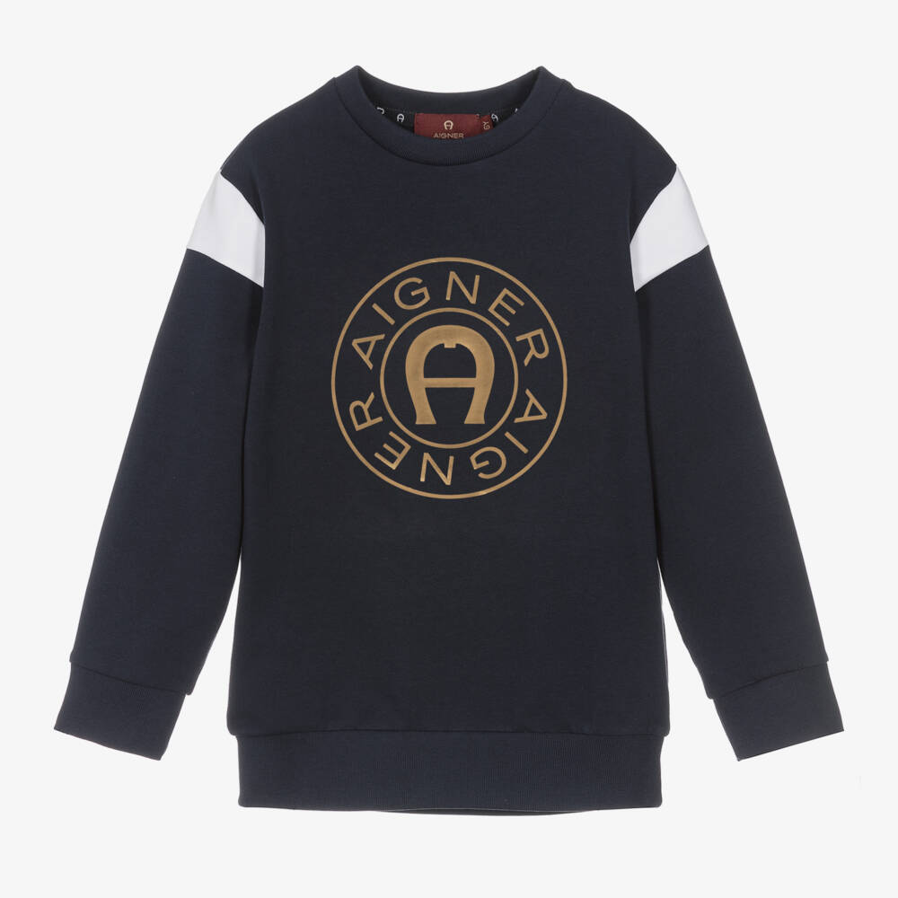Casual navy blue sweatshirt for boys by AIGNER, made in soft cotton jersey. There is a metallic gold circular logo print on the chest of this long-sleeved style, featuring the designer's signature 'A' horseshoe, for instant branded appeal. White stripes on the shoulders add a sporty touch, and the cuffs and hem are both ribbed for comfort.