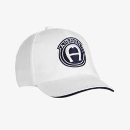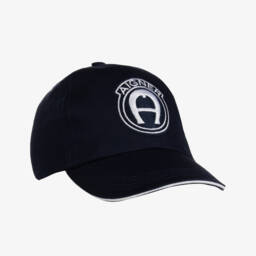 Classic navy blue cotton twill cap for boys by AIGNER, with the signature 'A' horseshoe logo embroidered in navy blue and white on the front. It has adjustable velcro fastening straps on the back for a comfortable fit.