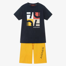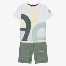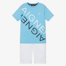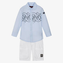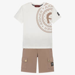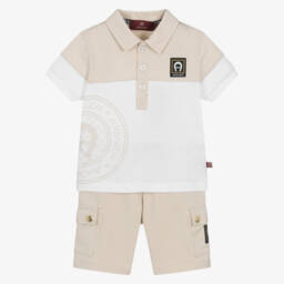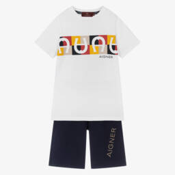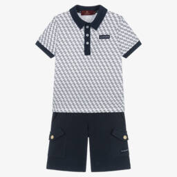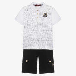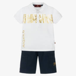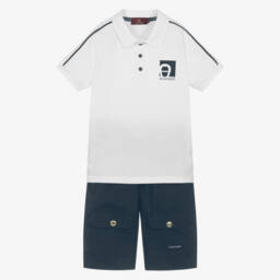 Detailed with shiny gold logos, featuring AIGNER's signature 'A' horseshoe motif, a white and navy blue cotton shorts set for boys. The soft jersey polo shirt fastens with buttons at the neck and has a logo patch on one sleeve. It pairs with Bermuda-length cargo shorts. Soft and lightweight, they fasten with a zip and button and have a comfortable, adjustable waistband.
