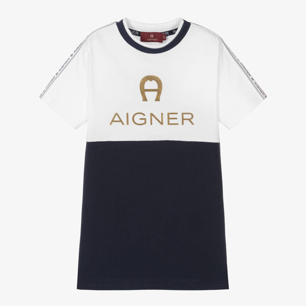 Designed by German brand AIGNER, a white and navy blue T-shirt for boys. Made in soft cotton jersey, it has a shiny gold signature 'A' horseshoe logo printed on the front and a casual crew neckline.