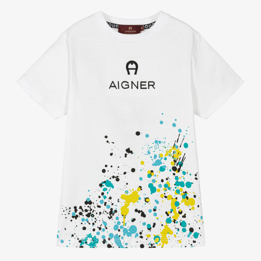 A white T-shirt for boys by AIGNER, comfortably made from soft cotton jersey. The brand's signature 'A' horseshoe logo is embroidered on the front for a recognisable look. Adding creativity and colour, the hem is printed with fun paint splatters.