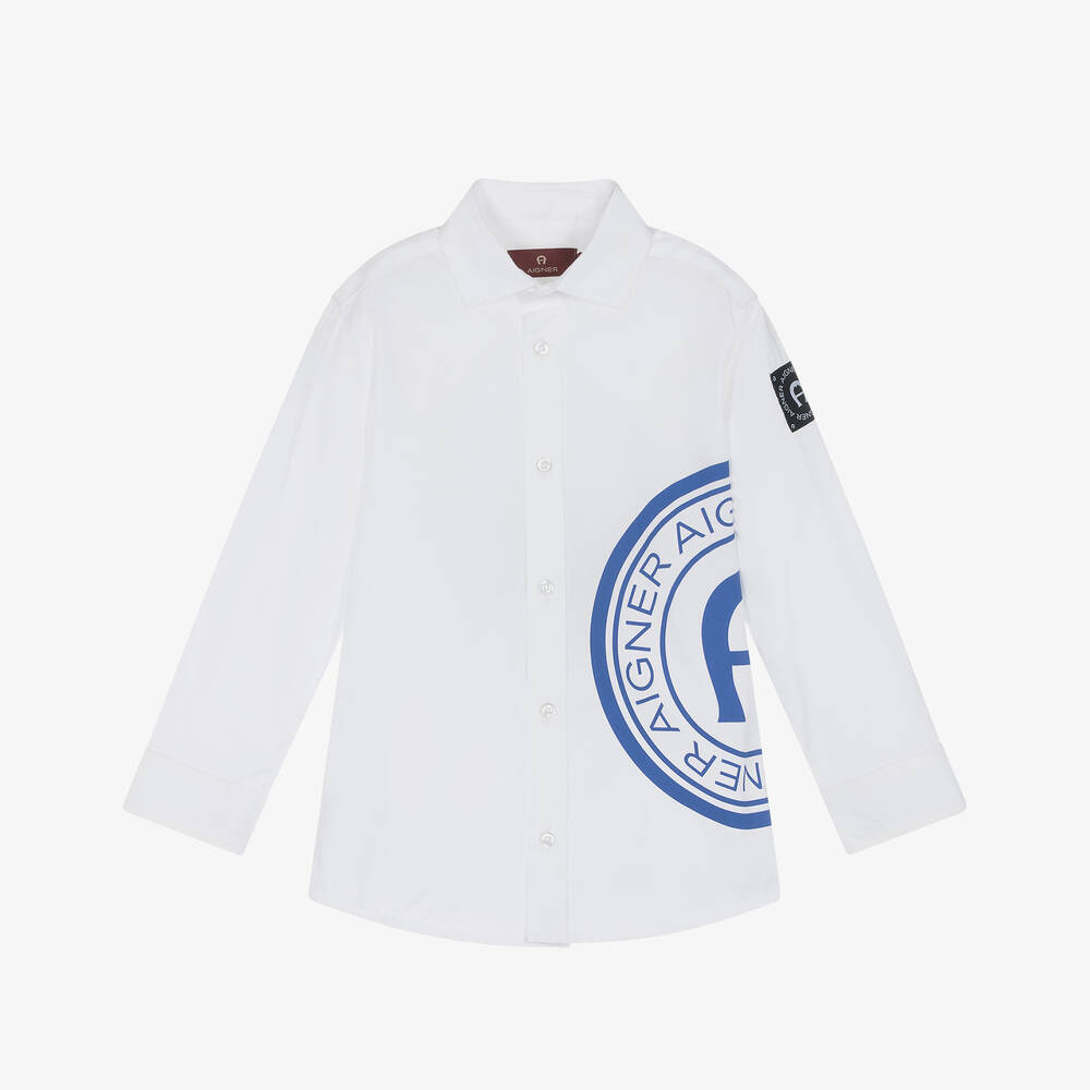 A smart white cotton shirt for boys by AIGNER, made in soft and lightweight poplin. Fastening with branded buttons on the front and cuffs, it has a bold blue logo print with the signature 'A' horseshoe motif on the front, and a branded patch on one sleeve.