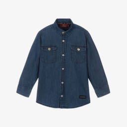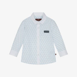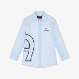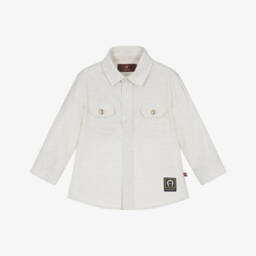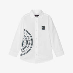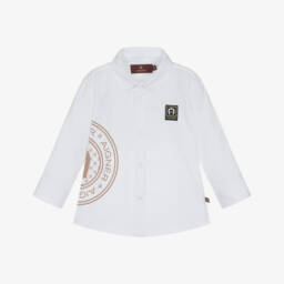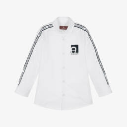 White shirt for boys by AIGNER, made in soft, smooth and lightweight cotton poplin. One side features navy blue, yellow and grey stripes patterned with the brand's signature 'A' horseshoe logos. Ideal for both smart or casual wear, it fastens with branded buttons and has a matching embroidered logo on the chest in navy blue.