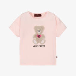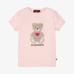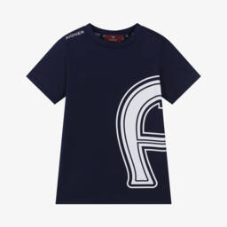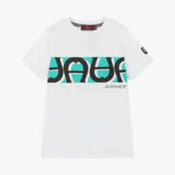 White T-shirt for boys by AIGNER, made in soft cotton jersey for cool and comfortable wear. This casual tee features a bold signature 'A' horseshoe logo design across the front in black and white on a turquoise green panel. An embroidered logo patch on one short sleeve completes this statement look.