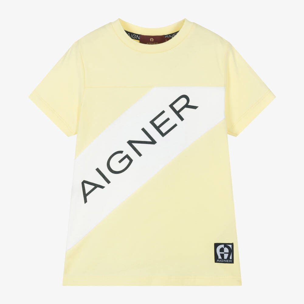 Yellow T-shirt for boys by AIGNER, made in soft and stretchy cotton jersey. For instant brand recognition, it features a bold white stripe across the front with a navy blue logo. Comfortable and easy wearing, it also has a logo patch by the hem featuring the signature 'A' horseshoe logo.