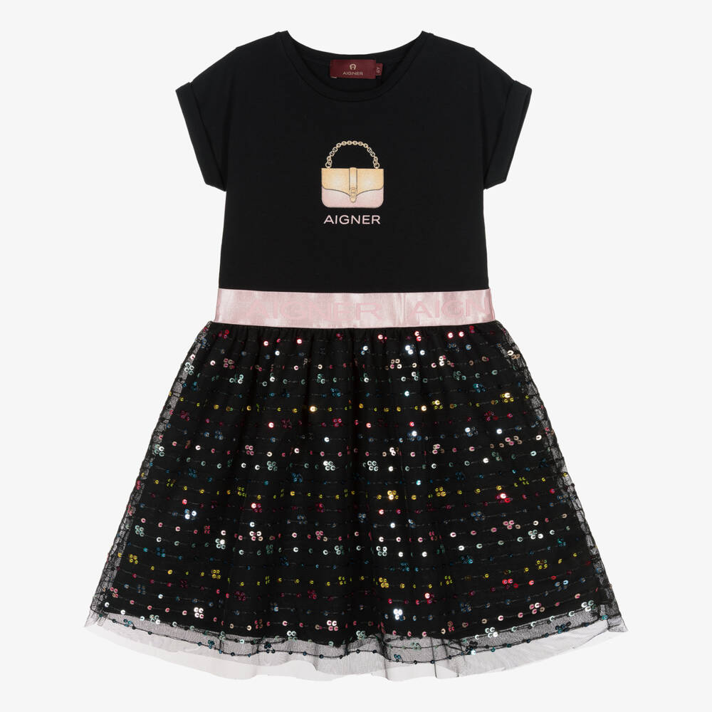 Lovely black dress for girls by AIGNER, with a shimmery gold and pink handbag logo motif on the front. Both comfortable and stylish, the bodice is made in soft jersey, with a contrasting pink logo waistband adding an extra branded touch. Made in soft tulle, the skirt is embellished with colourful sequins for additional sparkle and lined in soft voile for comfort.