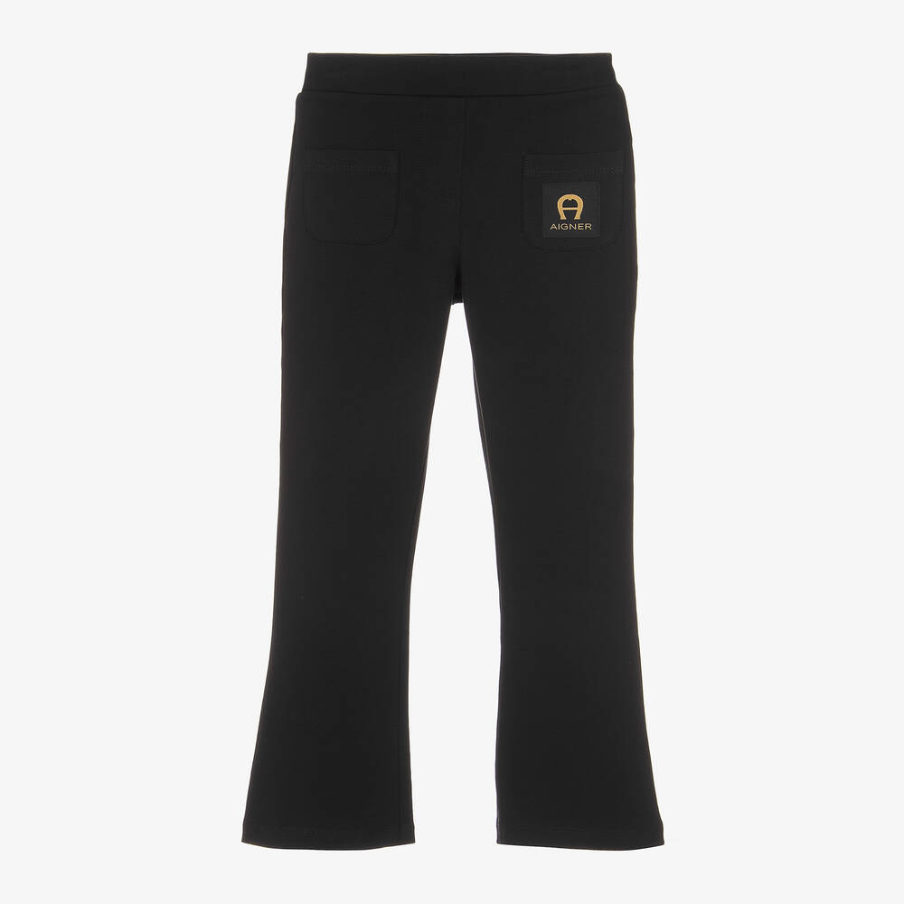 Stylish black full-length leggings for girls by AIGNER, with a cool flared silhouette. Made from soft mid-weight cotton jersey, they have an elasticated waistband for a comfortable fit. One of the patch pockets on the front is stitched with a signature 'A' horseshoe logo patch for a branded finish.
