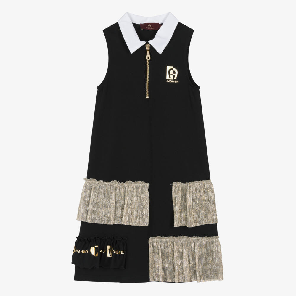 Black sleeveless dress for girls by AIGNER, made in soft cotton jersey. Printed with a metallic gold 'A' horseshoe logo on the chest for a designer look, this smart style has a contrasting white collar and fabulous gold ruffles on the skirt. For a luxe finish, there is a shiny gold zip fastening on the bodice.