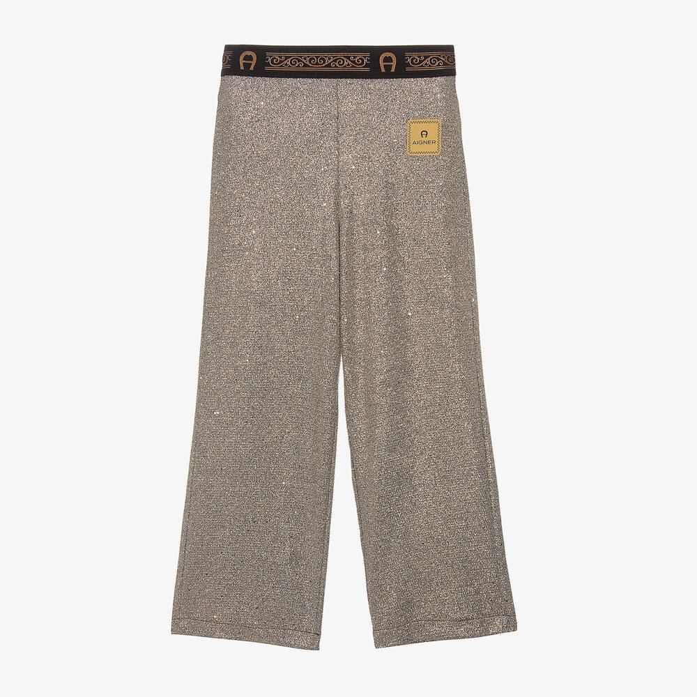 Striking gold glittery trousers for girls by AIGNER, in a cool wide leg style. Lightweight and stretchy, they are stitched with a gold branded patch on one side for a distinctive look. Printed with bronze rubberised signature 'A' horseshoe logos and ornate borders, the contrasting black elasticated waistband ensures a comfortable fit.