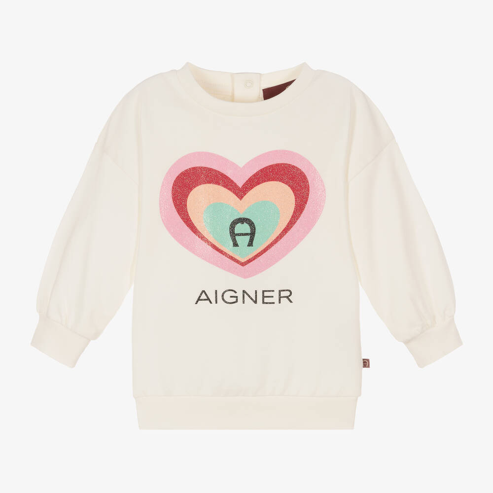 A ivory sweatshirt for little girls by AIGNER, made from the softest cotton jersey. Adding sparkle to this easy-to-wear top, a glittery pink heart is printed on the front, alongside the brand's signature 'A' horseshoe logo. There is a subtle logo tab on the side to finish off this casual style.