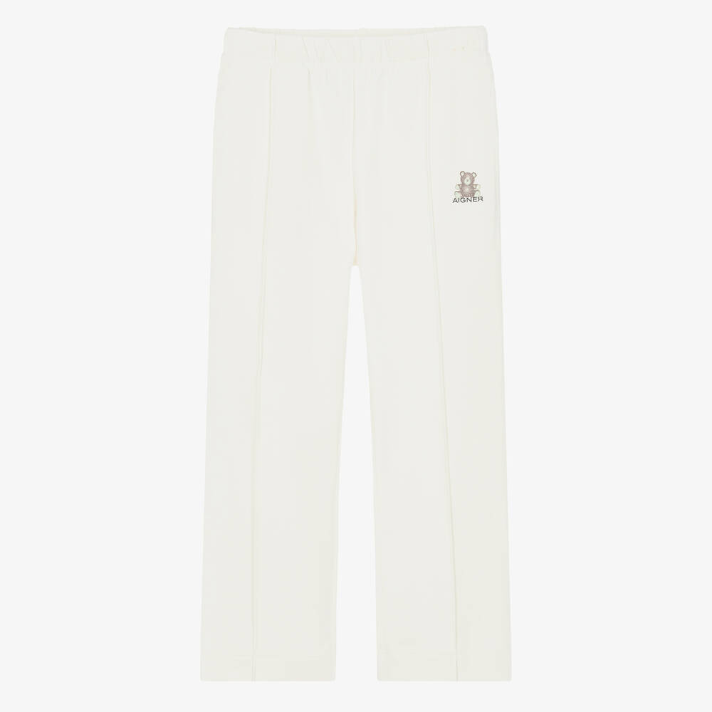 Casual ivory joggers for girls by AIGNER, made in soft cotton jersey. This pull-on style is styled with front seams on the straight legs and on-seam pockets. A cute, glittery teddy bear and logo motif are printed on one side.