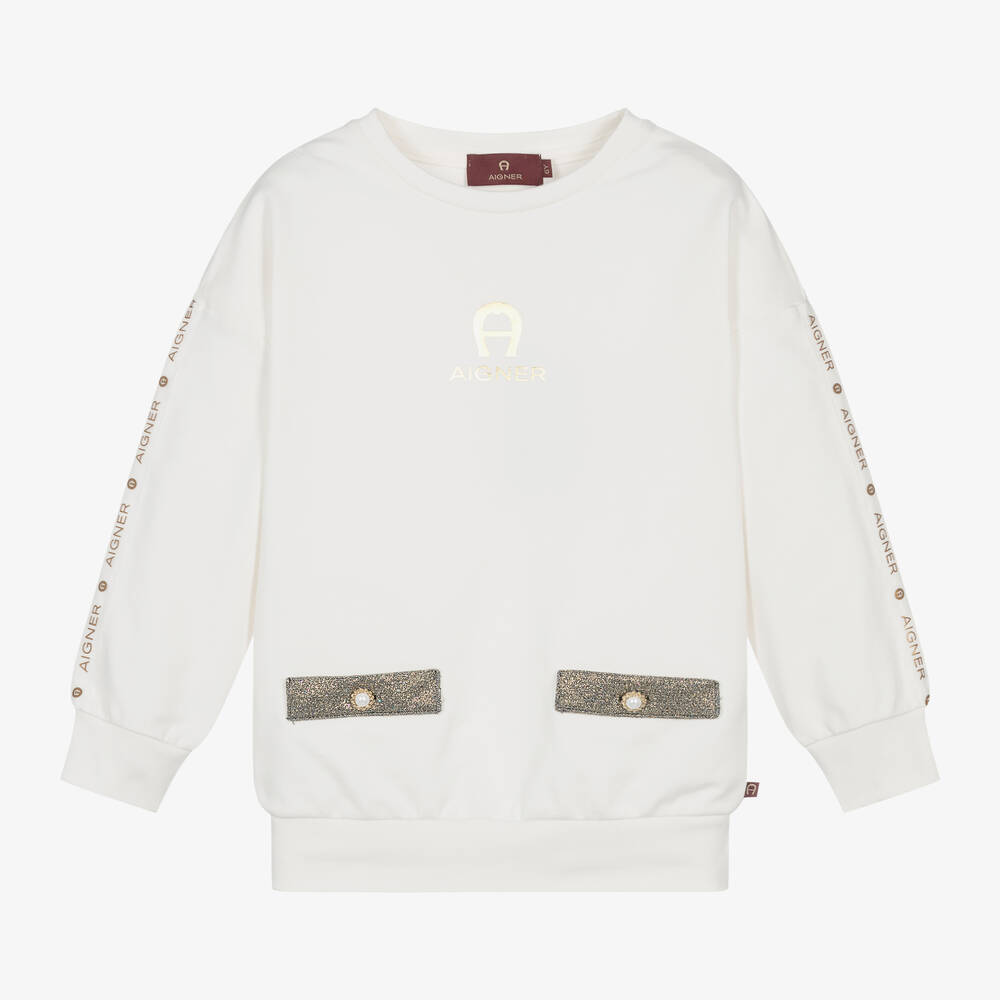 Ivory cotton sweatshirt for girls by AIGNER, made in soft and comfortable jersey. This casual wardrobe staple is elevated by glittery gold faux pocket trims decorated with shiny gold metal and pearl buttons. A relaxed, dropped shoulder fit, it has glittery, sheer logo tape on the long sleeves and a gold logo print on the chest featuring the signature 'A' horseshoe motif.