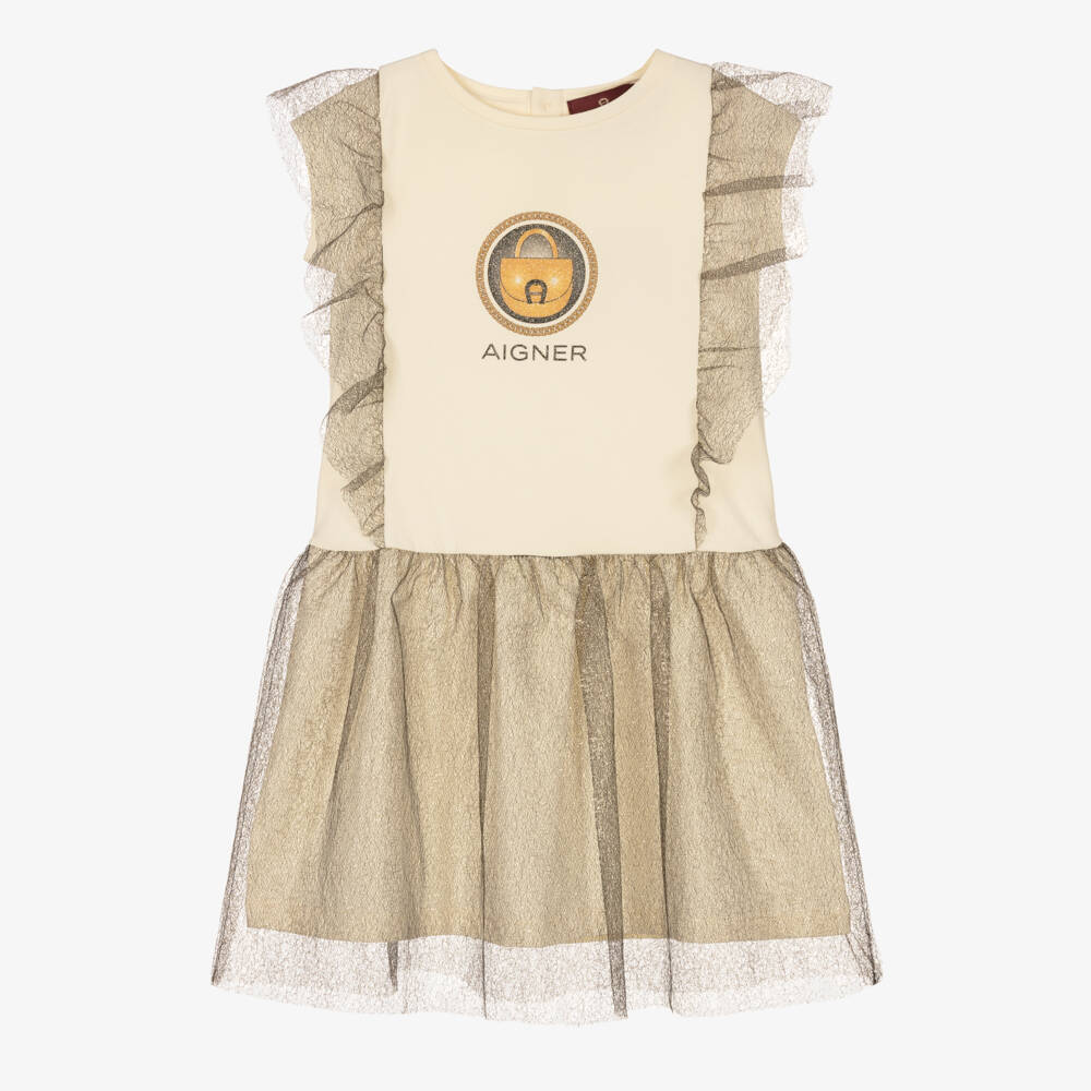 Comfortable ivory dress for girls by AIGNER, made in soft cotton jersey. For an elevated party look, it has ruffles on the bodice and a gathered overlay on the skirt in fine patterned gold and black tulle. There are button fastenings on the back, and to complete the look, there is a glittery black and gold bag logo design on the chest, incorporating the brand's signature 'A' horseshoe motif.