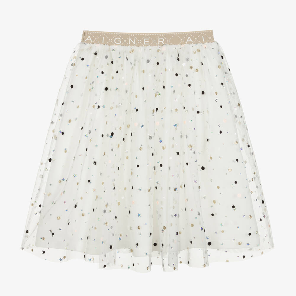 Girls pretty ivory tulle skirt from AIGNER, scattered with embroidered gold, pink and black dots and iridescent stars. Comfortably lined in soft cotton jersey, it has an elasticated beige waistband with a white patterned logo design.