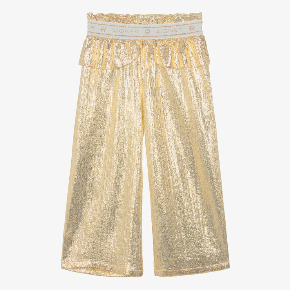 Girls metallic gold trousers by german brand AIGNER, with a pretty peplum on the waist for a feminine look. Ideal for a special occasion, these soft and stylish trousers have a comfortable, ivory elasticated waistband. There are sparkly logo trims featuring the brand's 'A' horseshoe logo for a signature look.