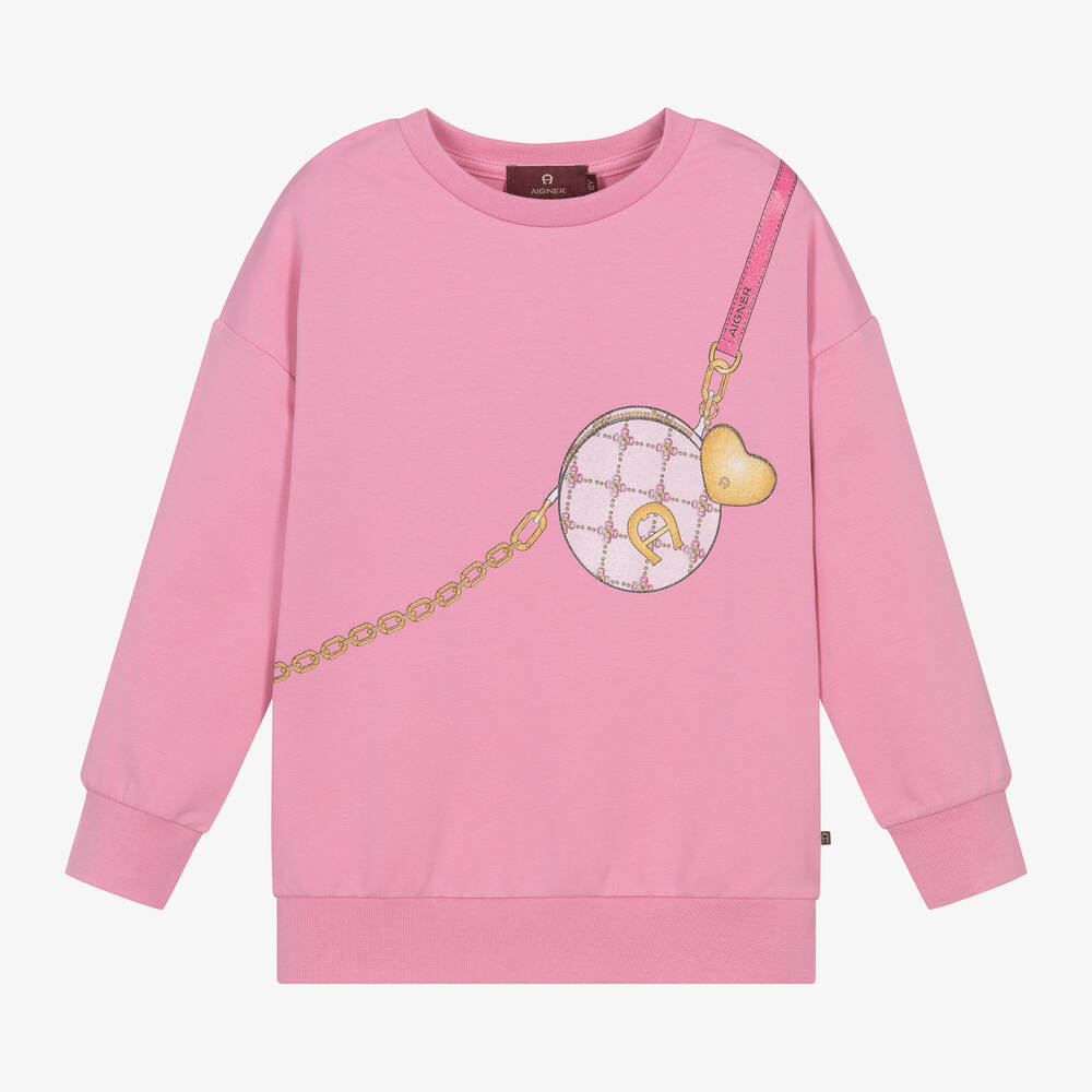 Pretty in pink, this lightweight cotton sweatshirt for girls is from German brand AIGNER. It is made in soft jersey with a relaxed fit and dropped shoulder long sleeves. For a distinctive designer touch, it has a gorgeous, glittery bag print on the front in pink and gold, featuring the label's signature 'A' horseshoe motif. A branded tab on the side seam completes the look.