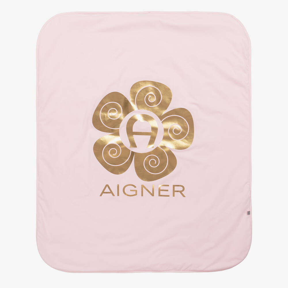 Pale pink Pima cotton blanket for baby girls by AIGNER. Cosy and comfortable, it is made in super soft jersey and lightly padded. One side is printed with the designer's signature 'A' horseshoe, in a bold metallic gold flower design. Ideal for use in the car or stroller, it also makes a lovely nursery accessory.