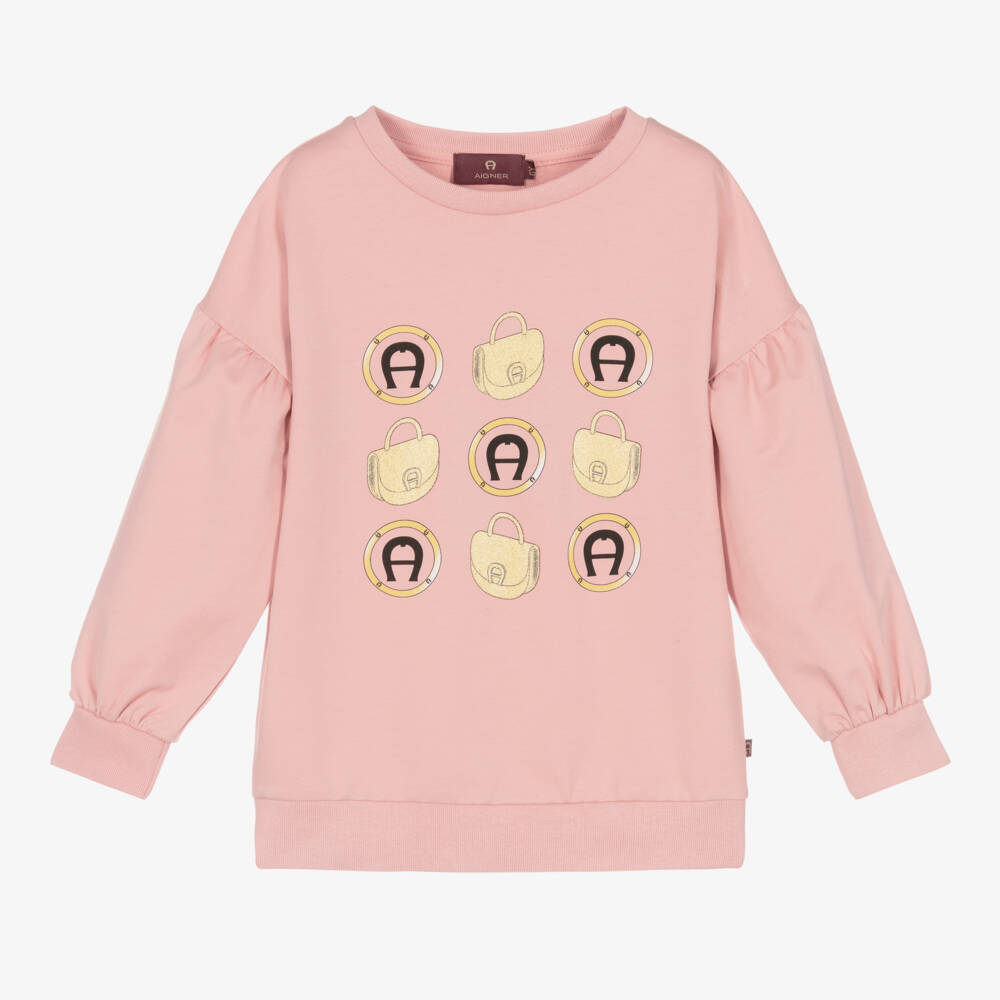 Blush pink sweatshirt for girls by AIGNER, made in soft cotton jersey. Comfortable and easy to wear, this crew neck top has dropped shoulders and ribbed trims for a relaxed fit. The glittery gold handbag design on the front is complemented by the brand's signature 'A' horseshoe logo for a girly and instantly recognisable look.