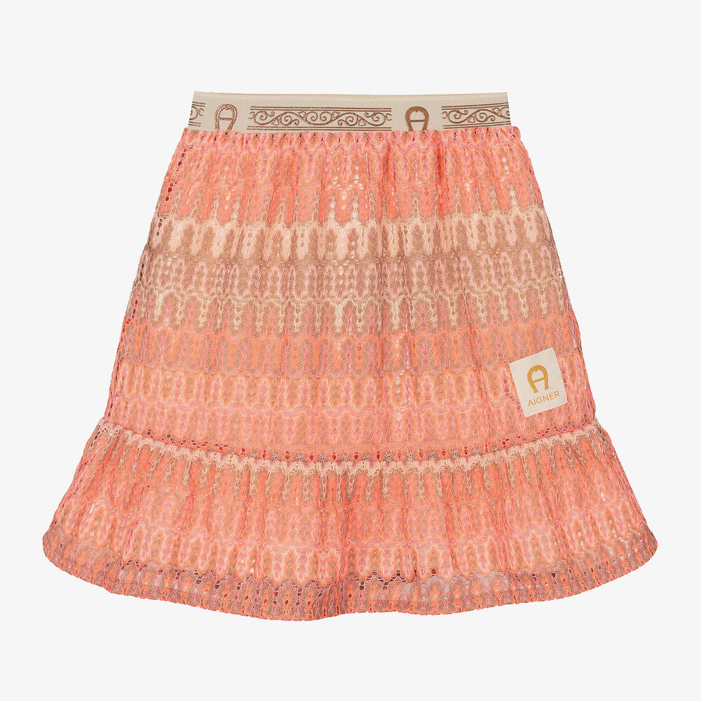 Beautiful neon pink and beige skirt for girls by AIGNER, in a soft and delicate crochet lace weave with an embroidered logo patch on the front. Easy to slip on, it has a beige elasticated waistband with a repeat logo design featuring a filigree pattern and the signature 'A' horseshoe for an added designer touch. Fully lined with lightweight cotton for comfort and modesty, this pretty skirt has a frilled hemline,