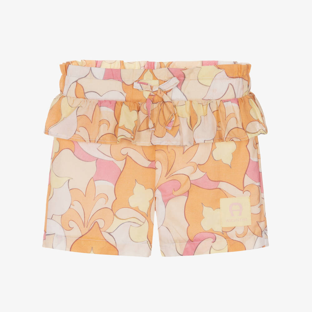 Cute cotton shorts for little girls by AIGNER, with an ornate pattern in pink and pale orange. Made for summery days in lightweight poplin, they have frills around the waist and are easy to wear, simply pulling up. The signature 'A' horseshoe logo badge is on one leg.