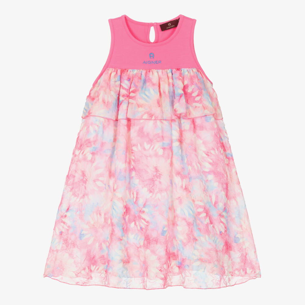 Cute pink dress for girls by AIGNER, in a lightweight, sleeveless style. Made in soft cotton jersey, the simple, stretchy bodice is embroidered with the designer's signature 'A' horseshoe logo in blue and fastens with a stylish keyhole button on the back. The gorgeous crinkled chiffon skirt has girly ruffles and a watercolour pattern, completing the look with a colourful pop of pastel.