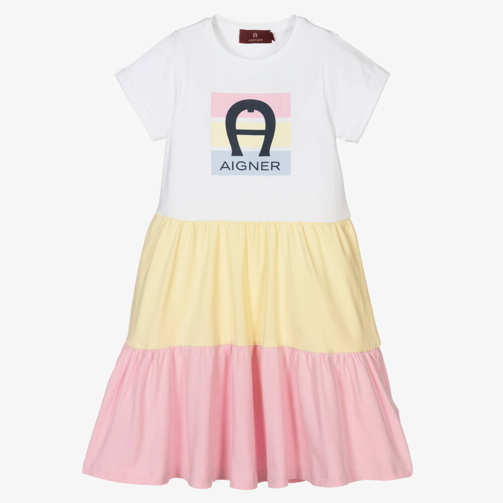 Girls white dress by AIGNER, made with soft and stretchy, comfortable cotton jersey. It has a pretty tiered skirt in pale pink and yellow and stitched roll sleeves. The signature 'A' horseshoe logo is printed in navy blue with stripes of pink, yellow and blue.