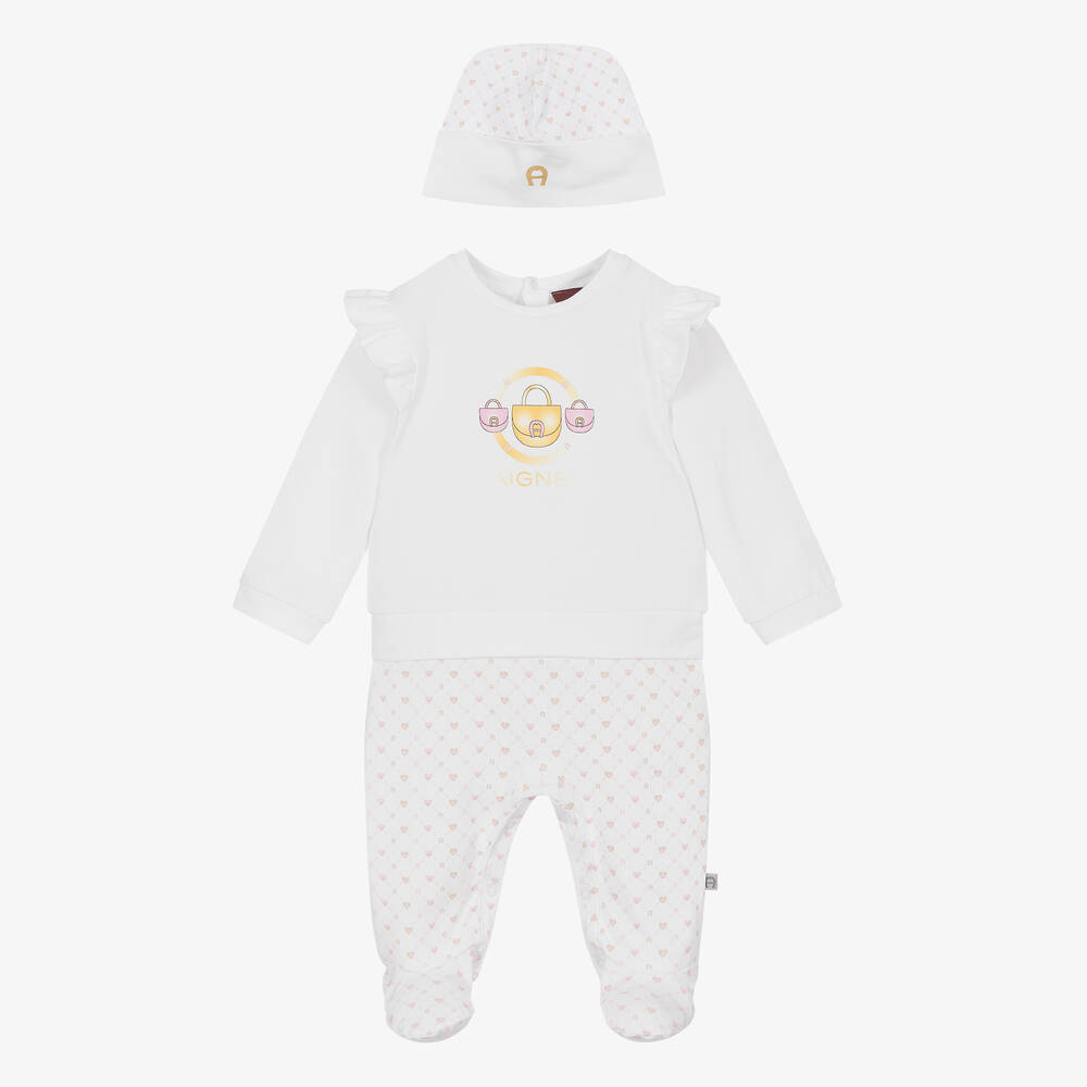 A white babysuit set for girls by AIGNER, made from soft Pima cotton jersey. Both items are printed with the brand's signature 'A' horseshoe logo in a pink heart monogram design. The babygrow has a yellow handbag motif and ruffled trims, whilst the hat has a gold foil logo. Poppers fasten easily on the back and between the legs of the babygrow. The set comes with a luxurious satin and organza branded pouch.